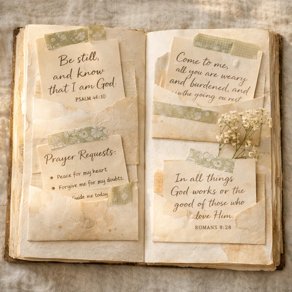 Simple techniques to layer Bible verses, handwritten prayers, and devotional prompts into your pages without it feeling cluttered or chaotic.